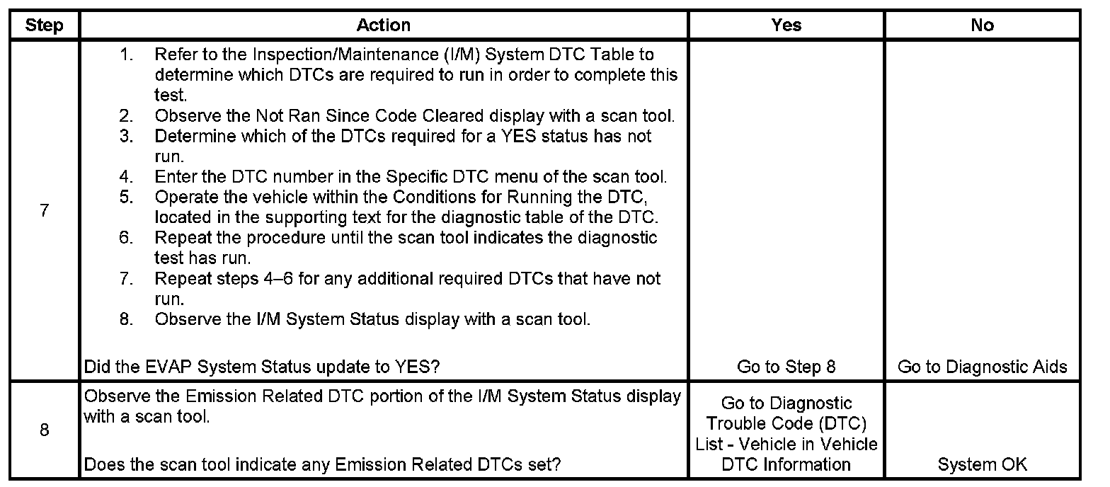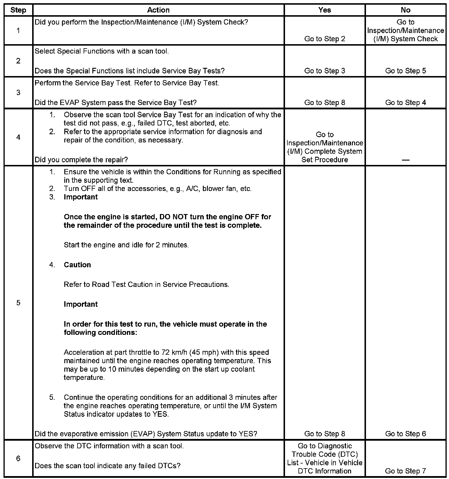 The purpose of this test is to satisfy the enable criteria necessary to execute inspection/maintenance (I/M) readiness diagnostics for the evaporative emission (EVAP) system. The test may be used to set the I/M System Status indicators to YES. The I/M System Status display on the scan tool indicates whether or not the control module has completed the required test. The required test is complete when either all of the DTCs comprising the test have run and passed, or when any one of the DTCs comprising the test has illuminated the malfunction indicator lamp (MIL). Once the test is complete, the I/M System Status display will indicate YES in the completed column. Performing a visual inspection prior to running the EVAP test may prevent having to repeat the test due to the fact that a failed or aborted test will require the vehicle to cool down in order to meet the enable criteria to run another test.
