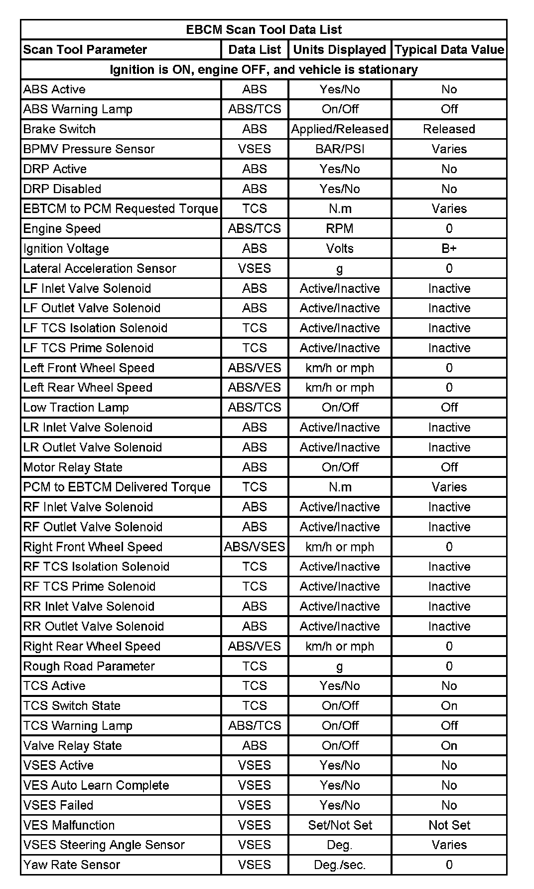 EBCM Scan Tool Data List