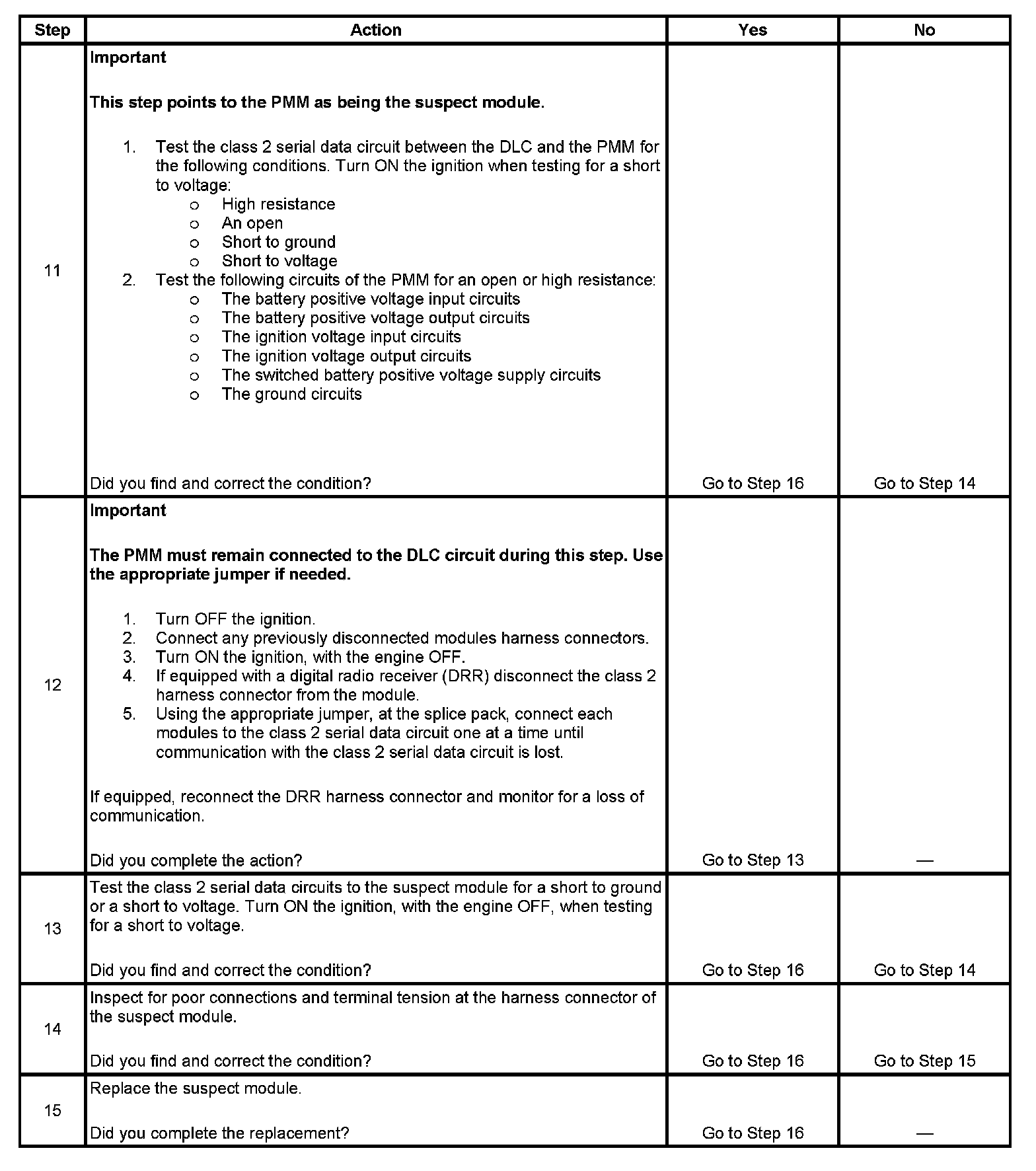 12. This step uses the loss of communications with a class 2 serial data circuit to locate the probable malfunction.On vehicles equipped with a digital radio receiver (DRR), the DRR must be isolated from the sensing and diagnostic module (SDM) to evaluate the condition of that class 2 serial data circuit branch. The following modules communicate on the class 2 serial data circuit: