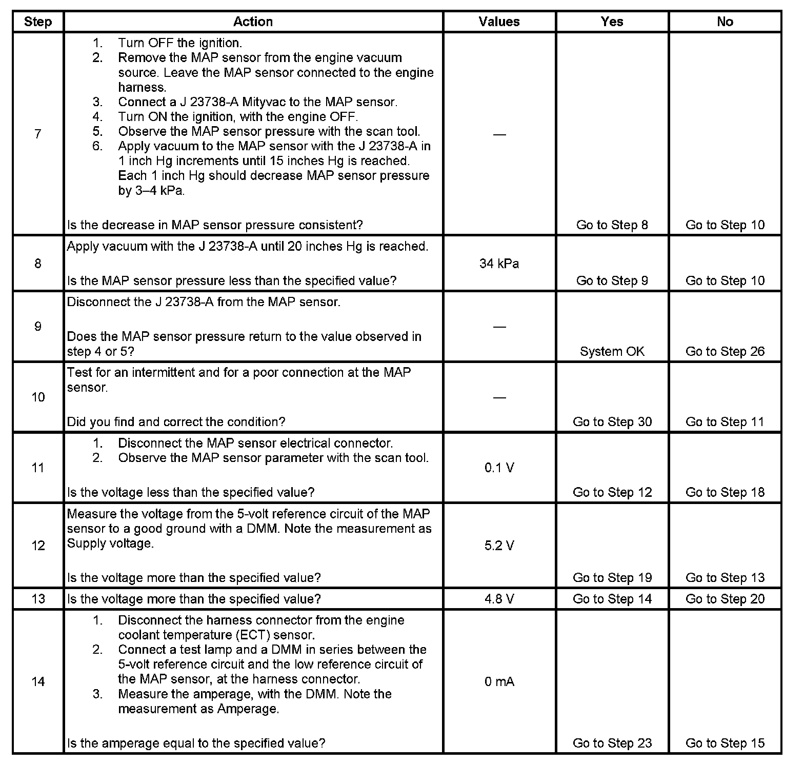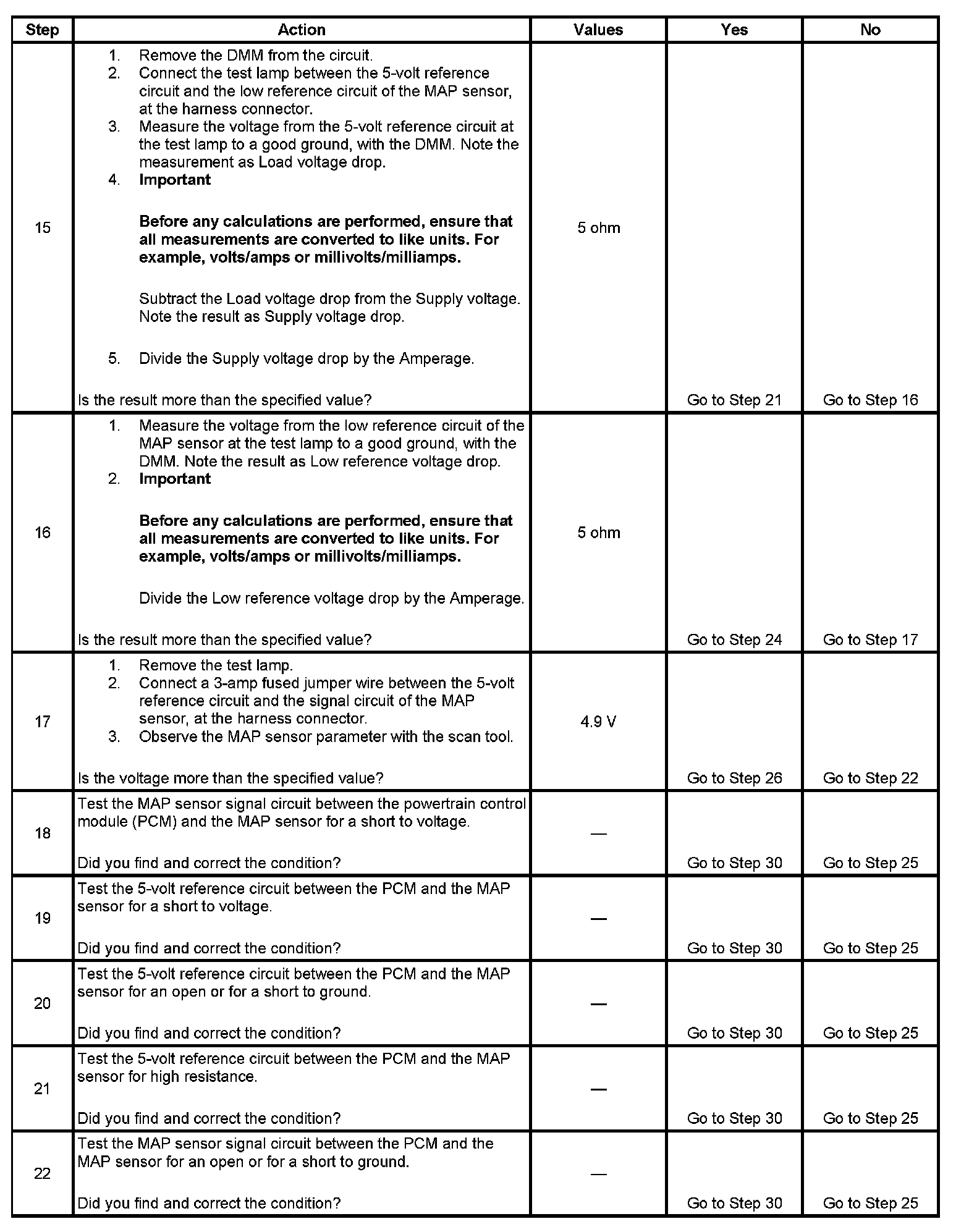 The manifold absolute pressure (MAP) sensor responds to changes in intake manifold pressure which gives an indication of the engine load. The MAP sensor has a 5-volt reference circuit, a low reference circuit, and a signal circuit. The powertrain control module (PCM) supplies 5 volts to the MAP sensor on the 5-volt reference circuit and provides a ground on the low reference circuit. The MAP sensor provides a signal to the PCM on the MAP sensor signal circuit, which is relative to the pressure changes in the manifold. With low MAP, such as during idle or deceleration, the PCM should detect a low MAP sensor signal voltage. With high MAP, such as ignition ON, engine OFF or wide open throttle (WOT), the PCM should detect a high MAP sensor signal voltage. The MAP sensor is also used in order to calculate the barometric pressure (BARO) when the ignition switch is turned ON, with the engine OFF. The BARO reading may also be updated whenever the engine is operated at WOT. The PCM monitors the MAP sensor signal for voltage outside of the normal range. If the PCM detects a MAP sensor signal voltage that is excessively low, DTC P0107 sets. If the PCM detects a MAP sensor signal voltage that is excessively high DTC P0108 sets.