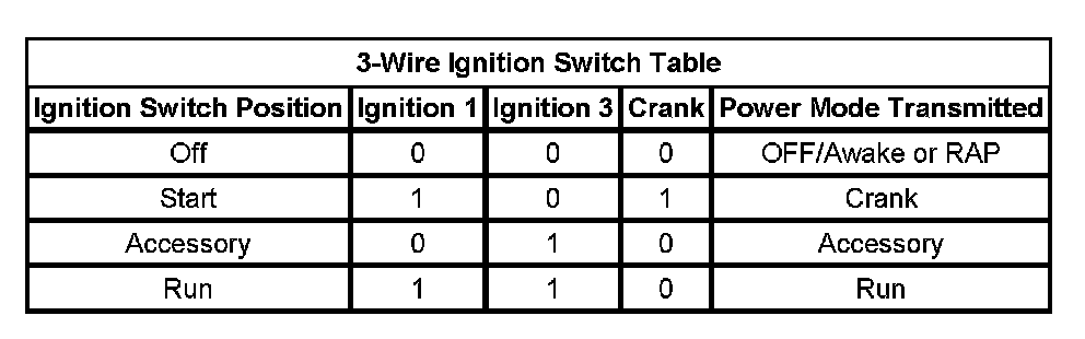 On vehicles that have several control modules connected by serial data circuits, one module is the power mode master (PMM). On this vehicle, the PMM is the body control module (BCM). The PMM receives 3 discrete ignition switch signals to differentiate which power mode will be sent over the Serial Data circuits. The table illustrates the state of these inputs in correspondence to the ignition switch position.