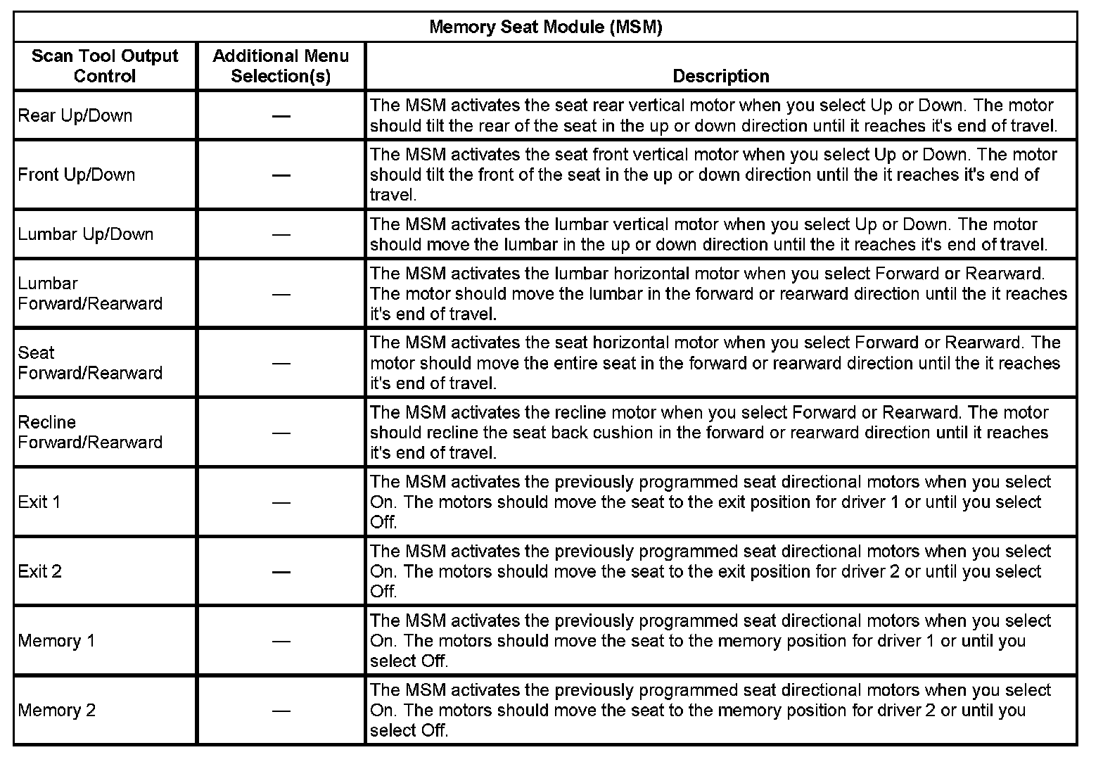 Scan Tool Output Controls - Memory Seat Module (MSM)