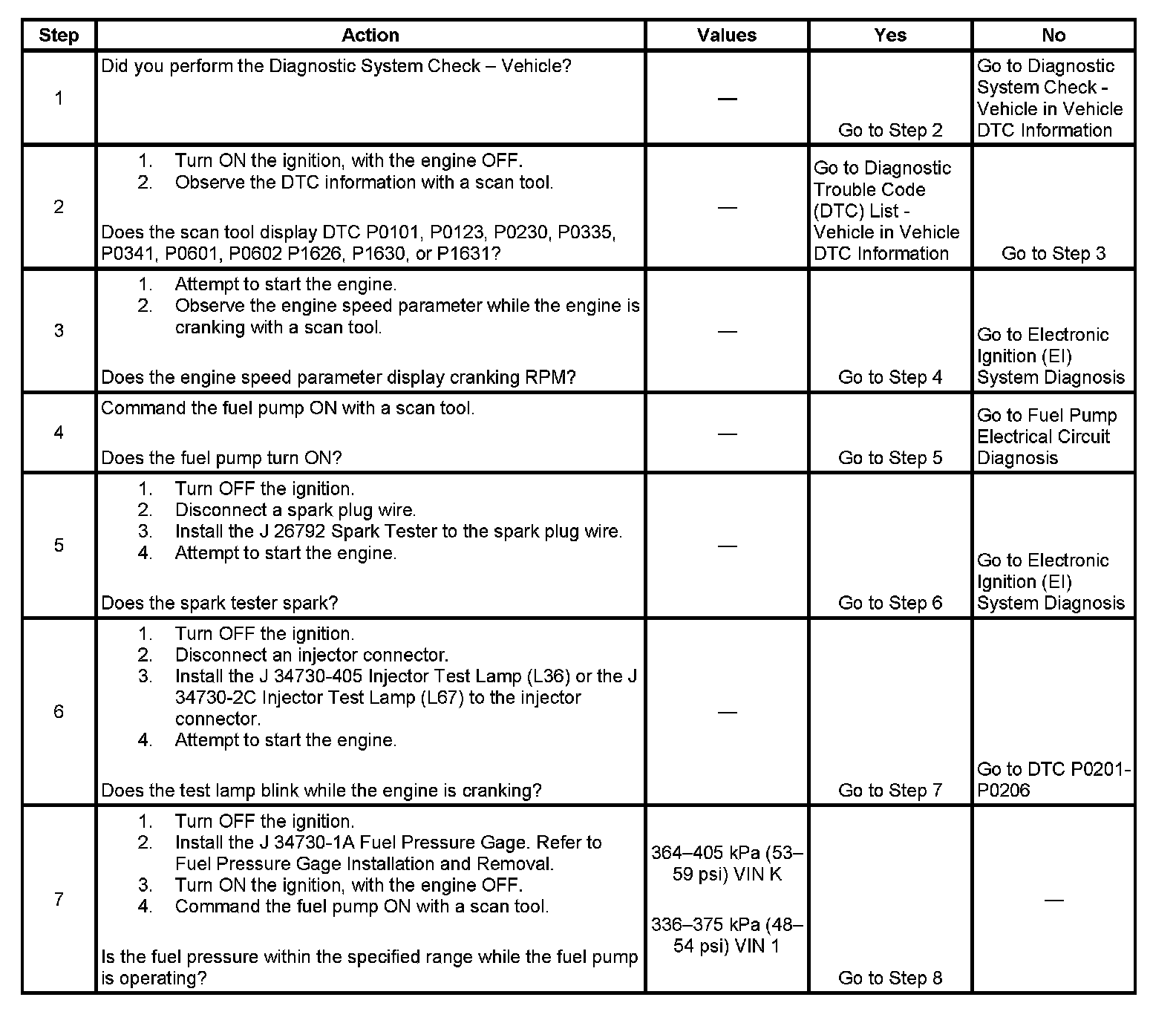 The Engine Cranks But Does Not Run diagnostic table assumes the following: