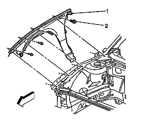 10. Remove the bolt (2) retaining the top of the fender (1) at the door hinge pillar.