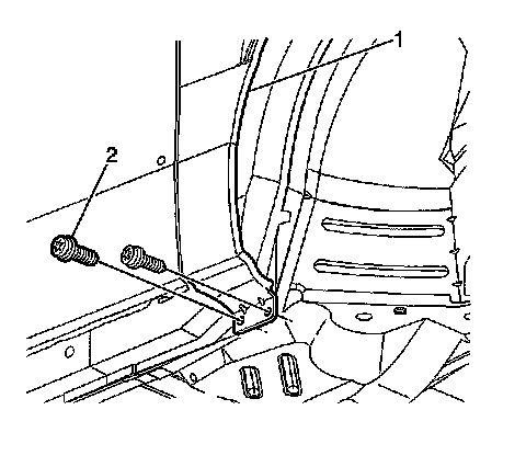 9. Remove the bolts (2) retaining the bottom of the fender (1) at the door hinge pillar.