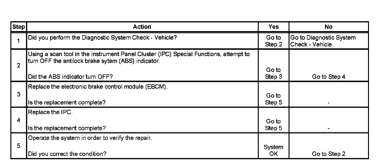 2. This step checks if the IPC has the ability to turn the ABS indicator OFF, or if the EBCM is sending an incorrect command to turn the ABS indicator ON.