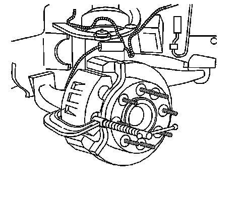 Notice: Support the brake caliper with heavy mechanic wire, or equivalent, whenever it is separated from its mount and the hydraulic flexible brake hose is still connected. Failure to support the caliper in this manner will cause the flexible brake hose to bear the weight of the caliper, which may cause damage to the brake hose and in turn may cause a brake fluid leak.