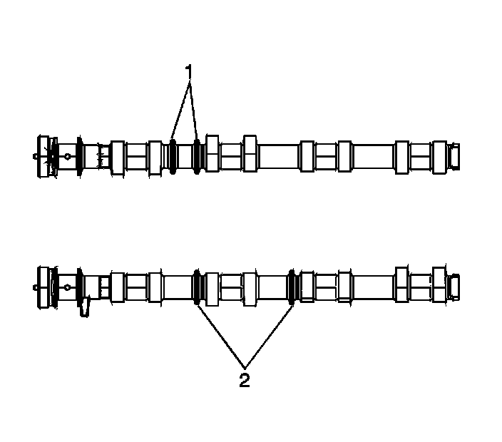 3. Select the proper camshaft by the identifying rings cast into the left exhaust camshaft (2).