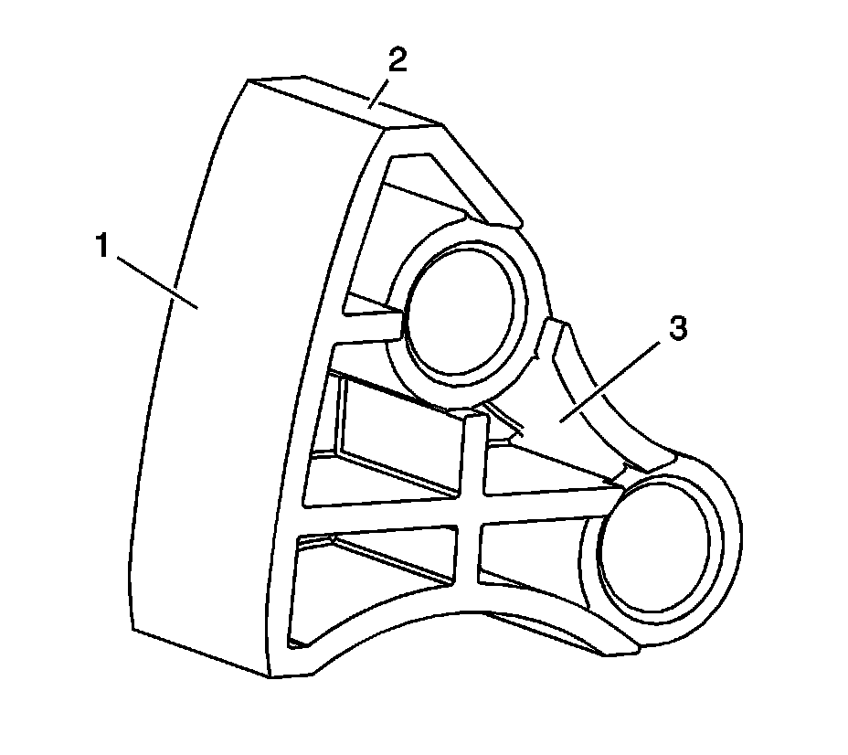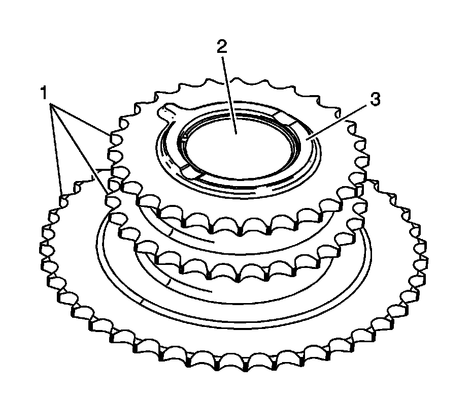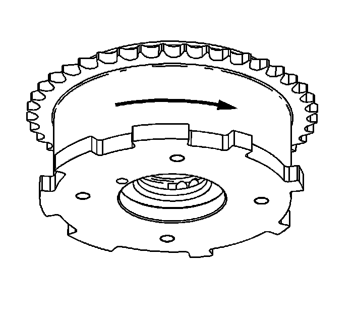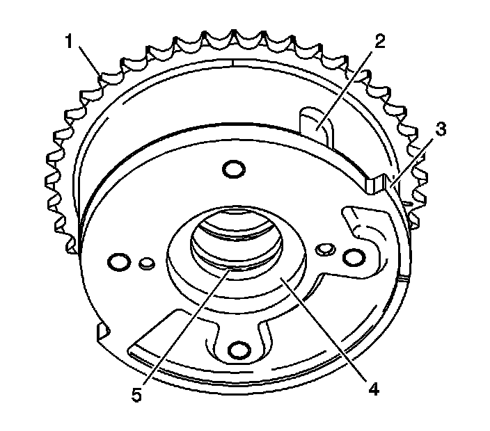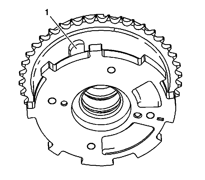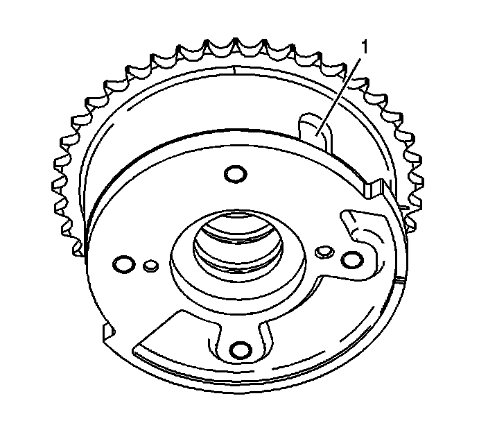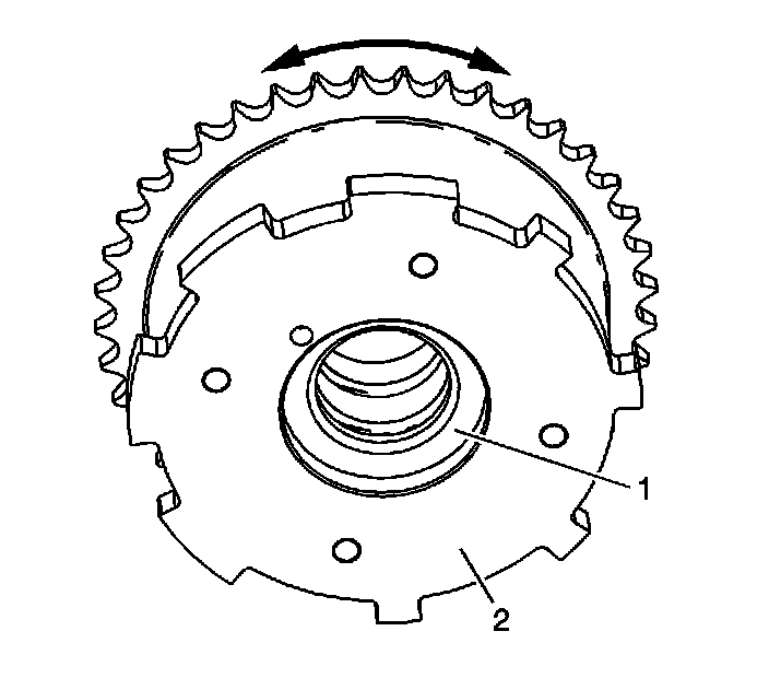 1. Inspect the intake camshaft position actuator to ensure the internal lock pin is engaged and the camshaft position actuator is parked in the home position. Attempt to rotate the inner rotor hub (1) within the outer housing (2).