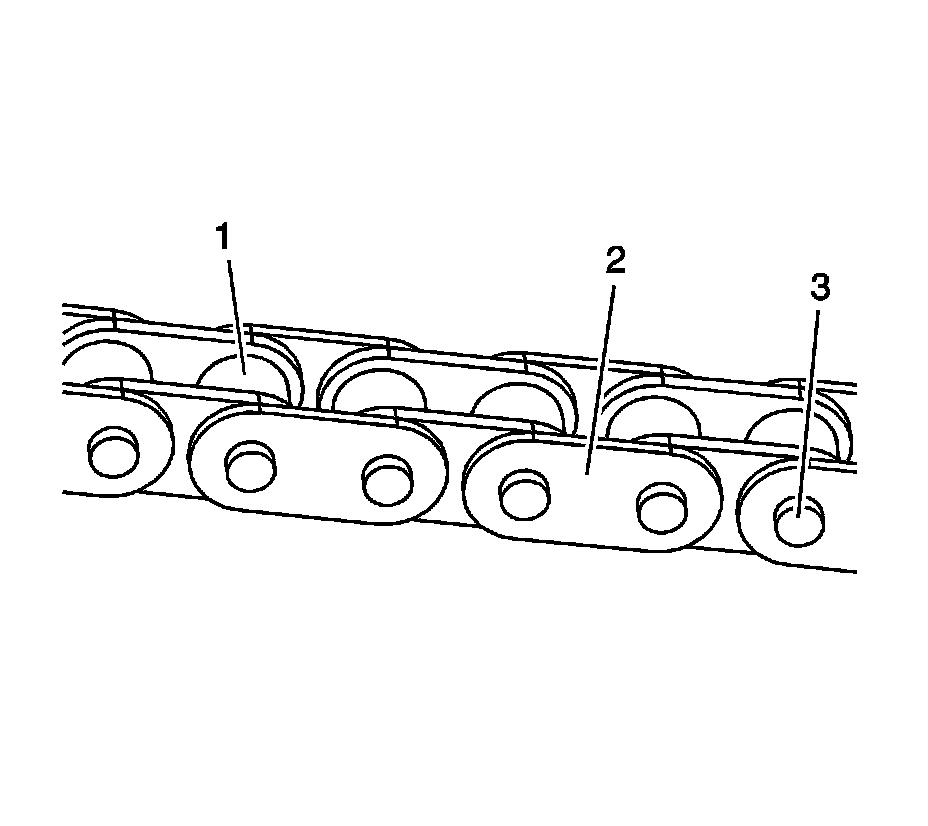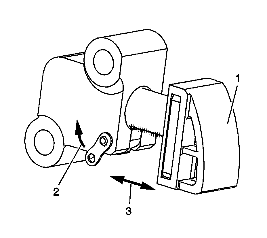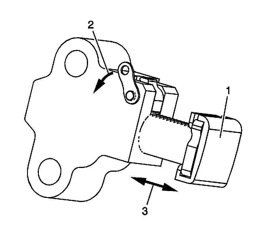 2. Inspect the primary timing chain tensioner for locked or binding timing chain tensioner. Release the locking lever (2) and ensure the plunger moves freely (3) in and out of the body of the tensioner.