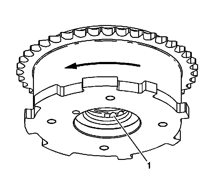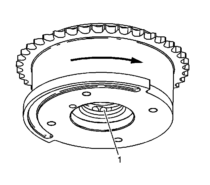 3. Inspect the intake camshaft position actuator for smooth and even movement. Using a pre-bent hex key, smaller than the oil passage, depress the internal lock pin through the oil passage (1) located within the hub of the camshaft position actuator. While viewing the intake camshaft position actuator from the front and with the lock pin depressed, the outer housing should be manually moved in the clockwise direction from the inner rotor hub.
