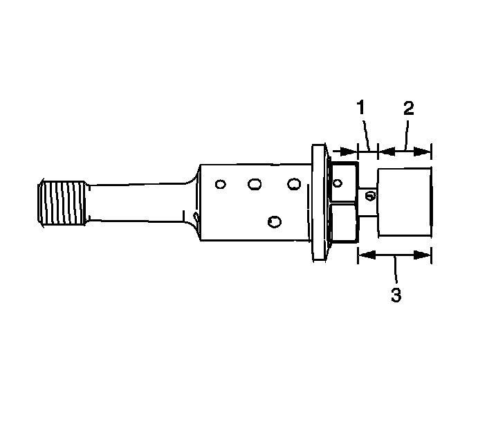 2. Inspect the camshaft position actuator oil control valves for proper movement of the spool valve. The valve should move a distance (2) of 4.35 mm (0.1713 in). Measure from the underside of the spool valve head. The home position is 2.25 mm (0.0886 in) above (1) the hex and the fully extended position measures 6.60 mm (0.2598 in) above (3) the hex.