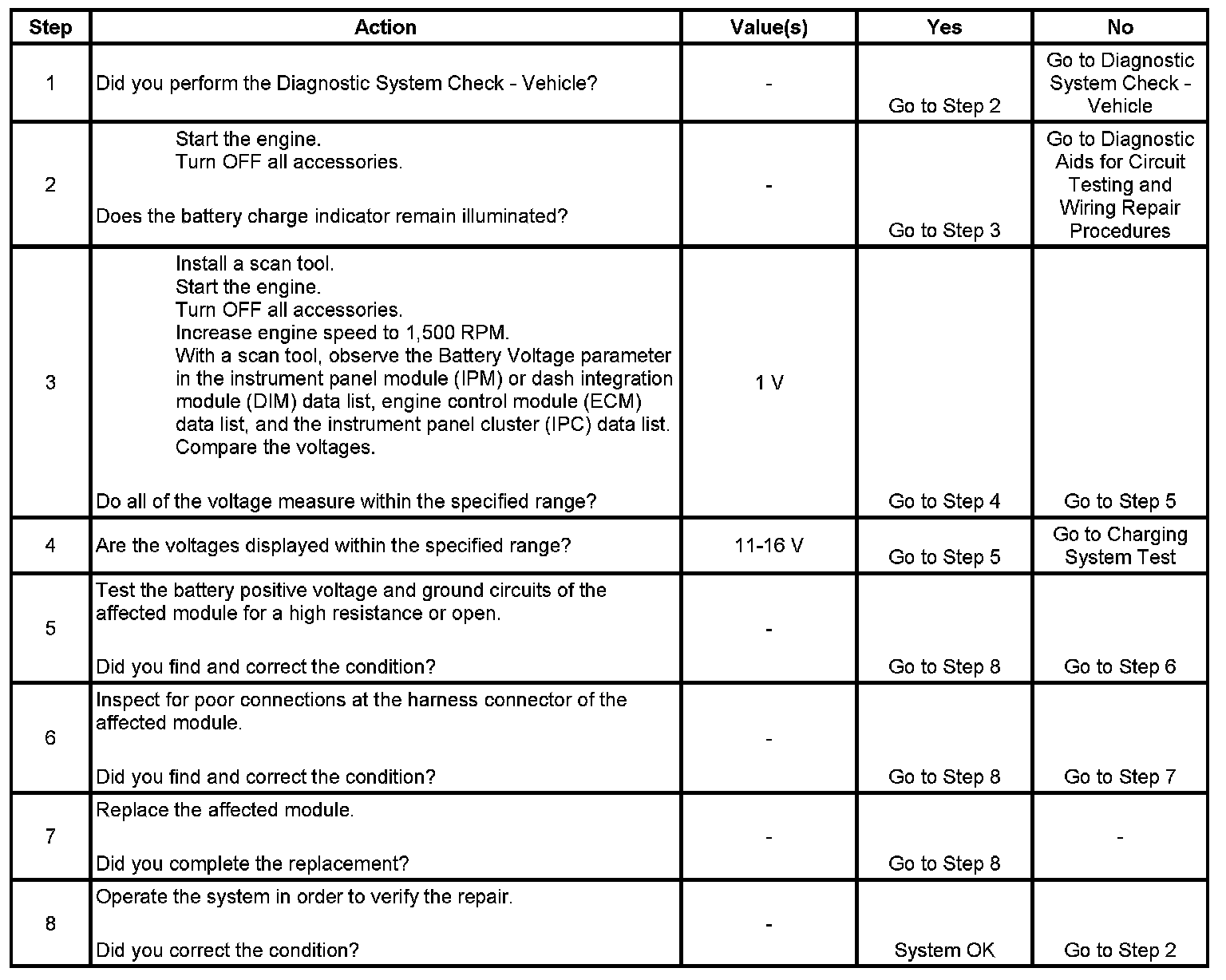 The driver information center (DIC) may display a "Charging System Failure" message. This message being displayed is the result of a class 2 message being sent by the engine control module (ECM), instrument panel module (IPM), dash integration module (DIM), or the instrument panel cluster (IPC) to the DIC. Each module has a different criteria for requesting the message to be displayed. Refer to Charging System Description and Operation.