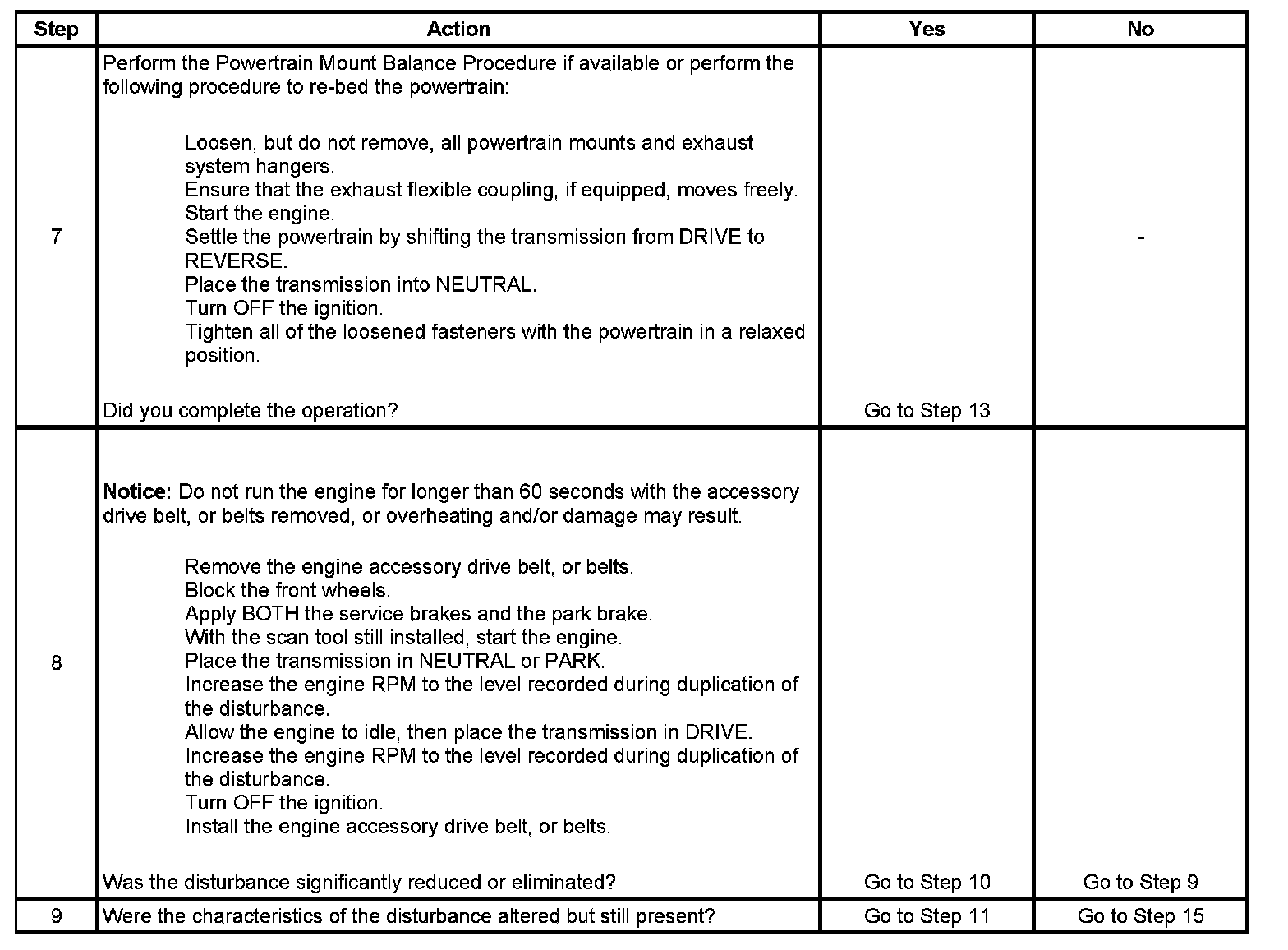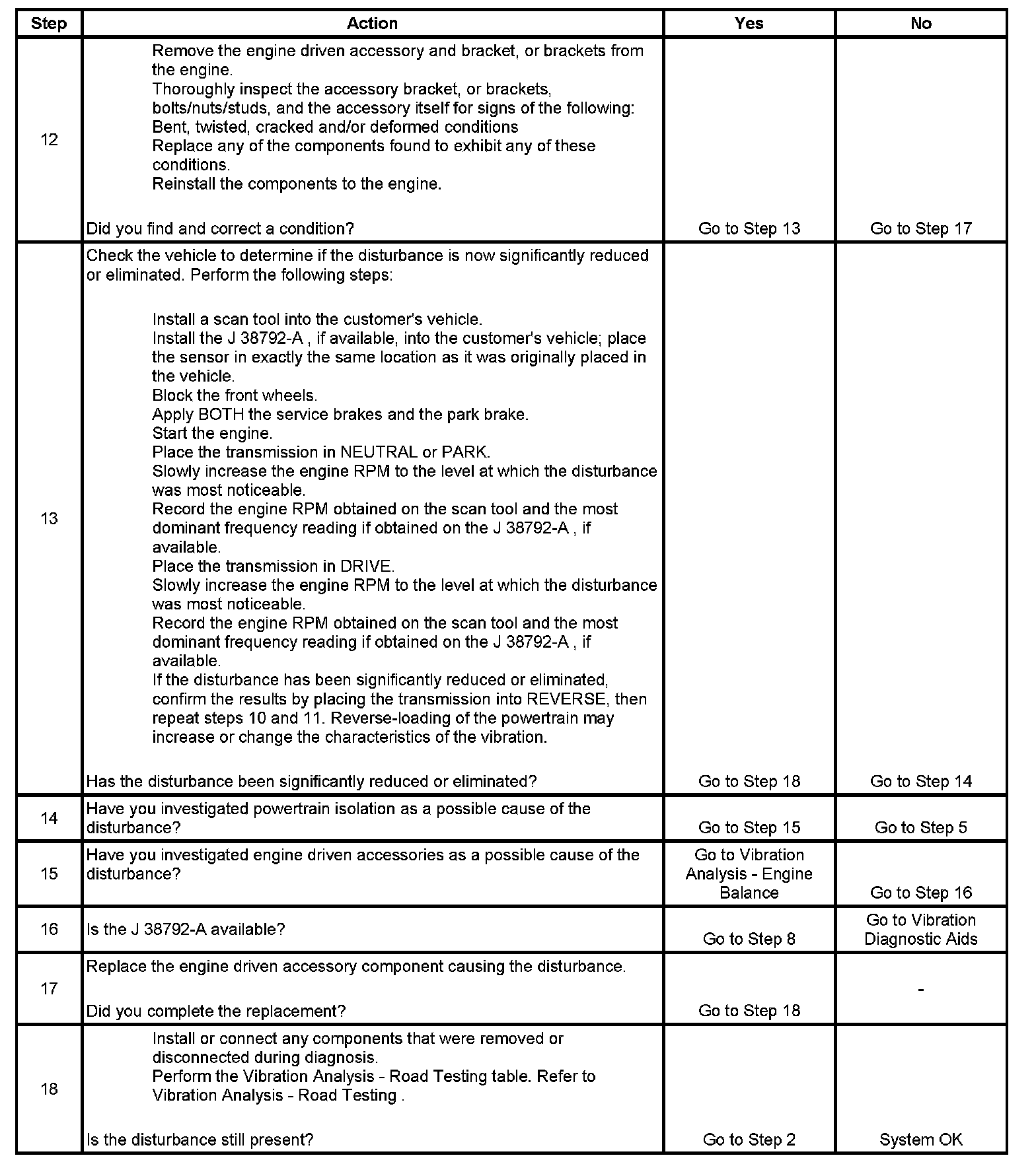 9. Non-rotating engine driven accessory components can no longer produce a unique disturbance. If a disturbance is still present, but the characteristics have been altered, it is possible that these component systems are acting as a transfer path for engine firing frequency or a first order engine disturbance.