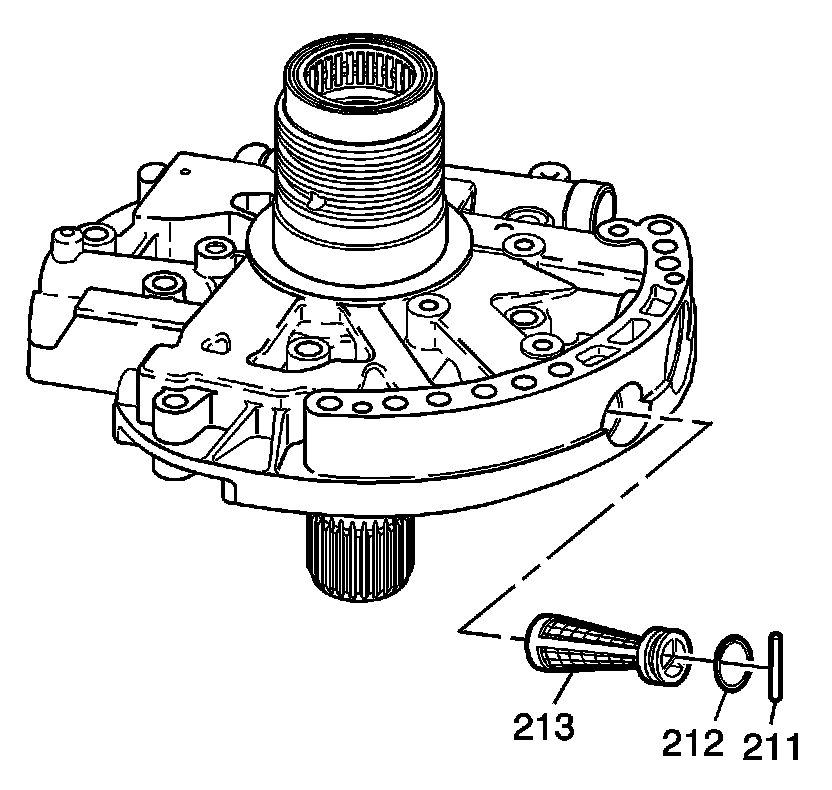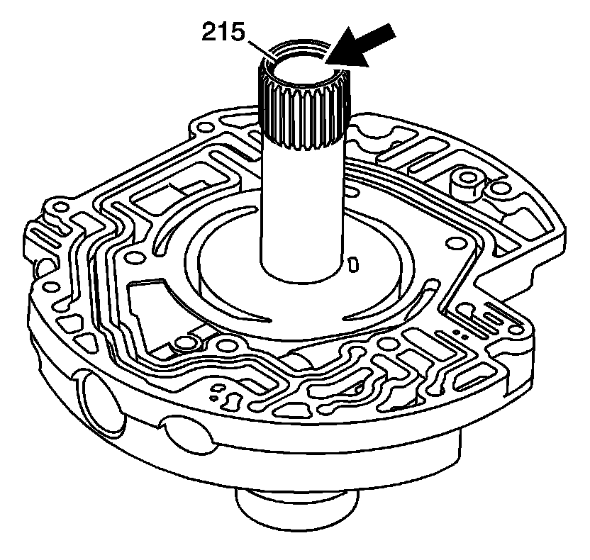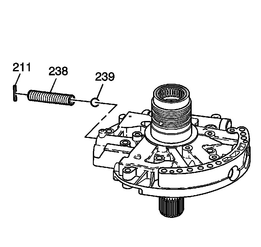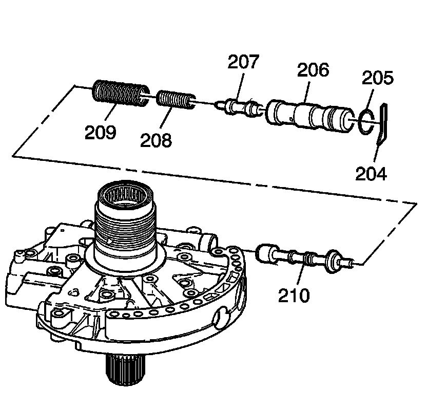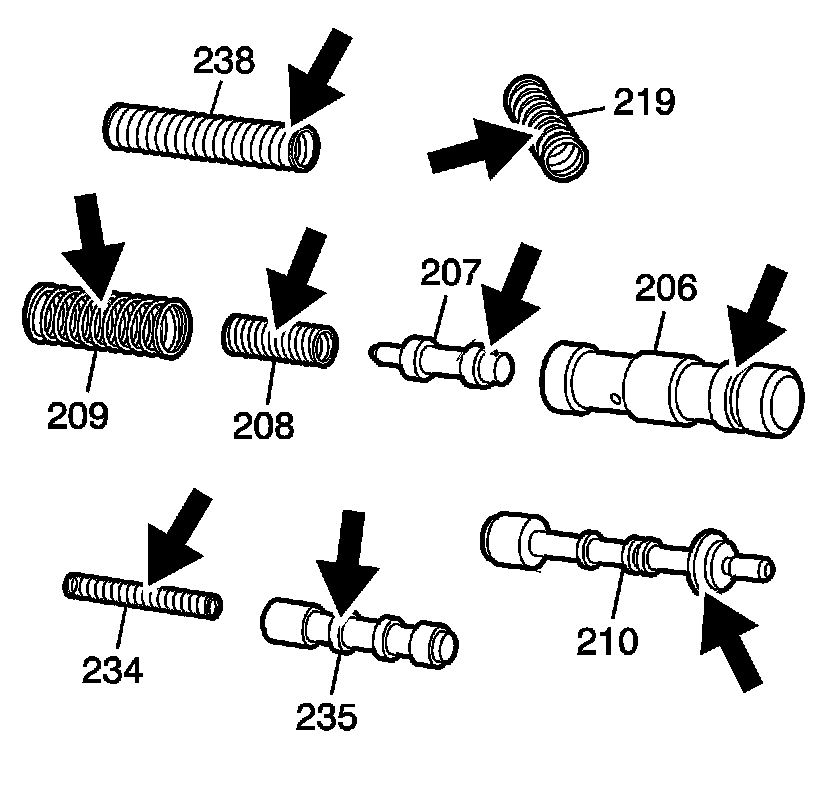 12. Install the pressure regulator valve (210), the pressure regulator valve spring (209), and the line boost valve spring (208).