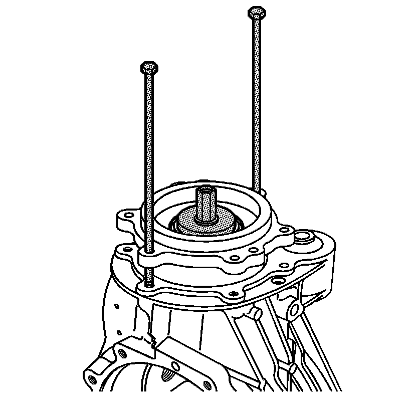 8. Using 2 long bolts from J 45019 as guides, align the bolt holes of the pinion cage and the carrier. Snug the bolts.