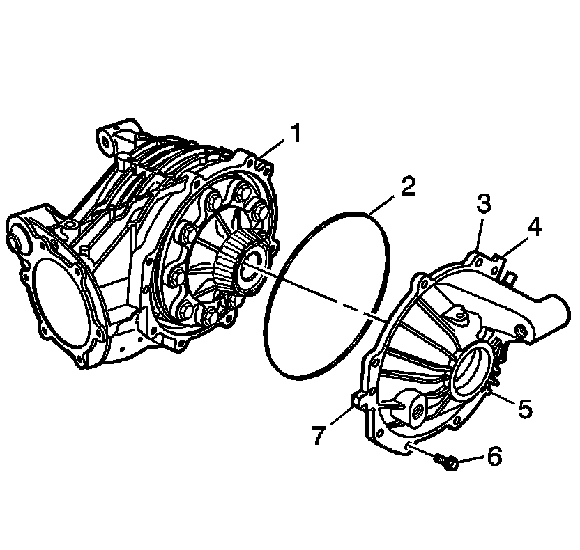 7. Using the pry tabs (4, 5, 7), remove the carrier cover (3) from the differential carrier (1).
