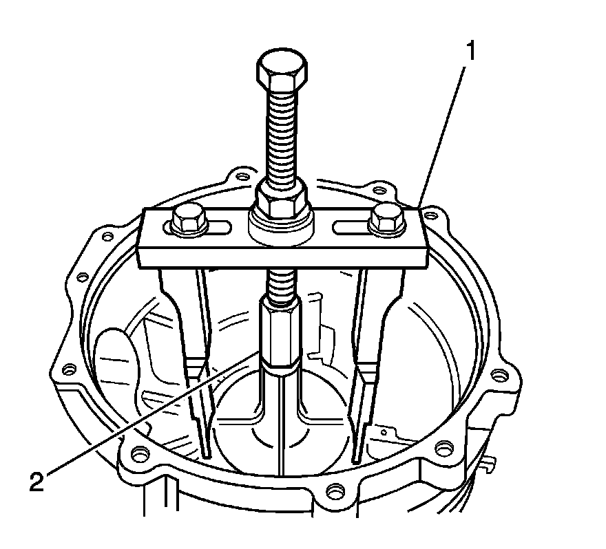 13. Install the J 45124 (1) over the DT-47595 (2) with the center bolt.