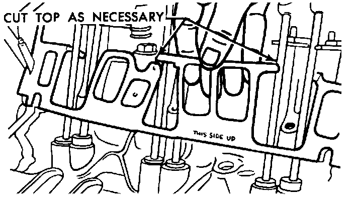 2. Install new intake gaskets on cylinder heads. Hold in place by extending ridge RTV bead up 6mm onto the gasket ends. The new intake gaskets will have to be cut, where indicated, to install behind push rods. Cut only those areas that are necessary.