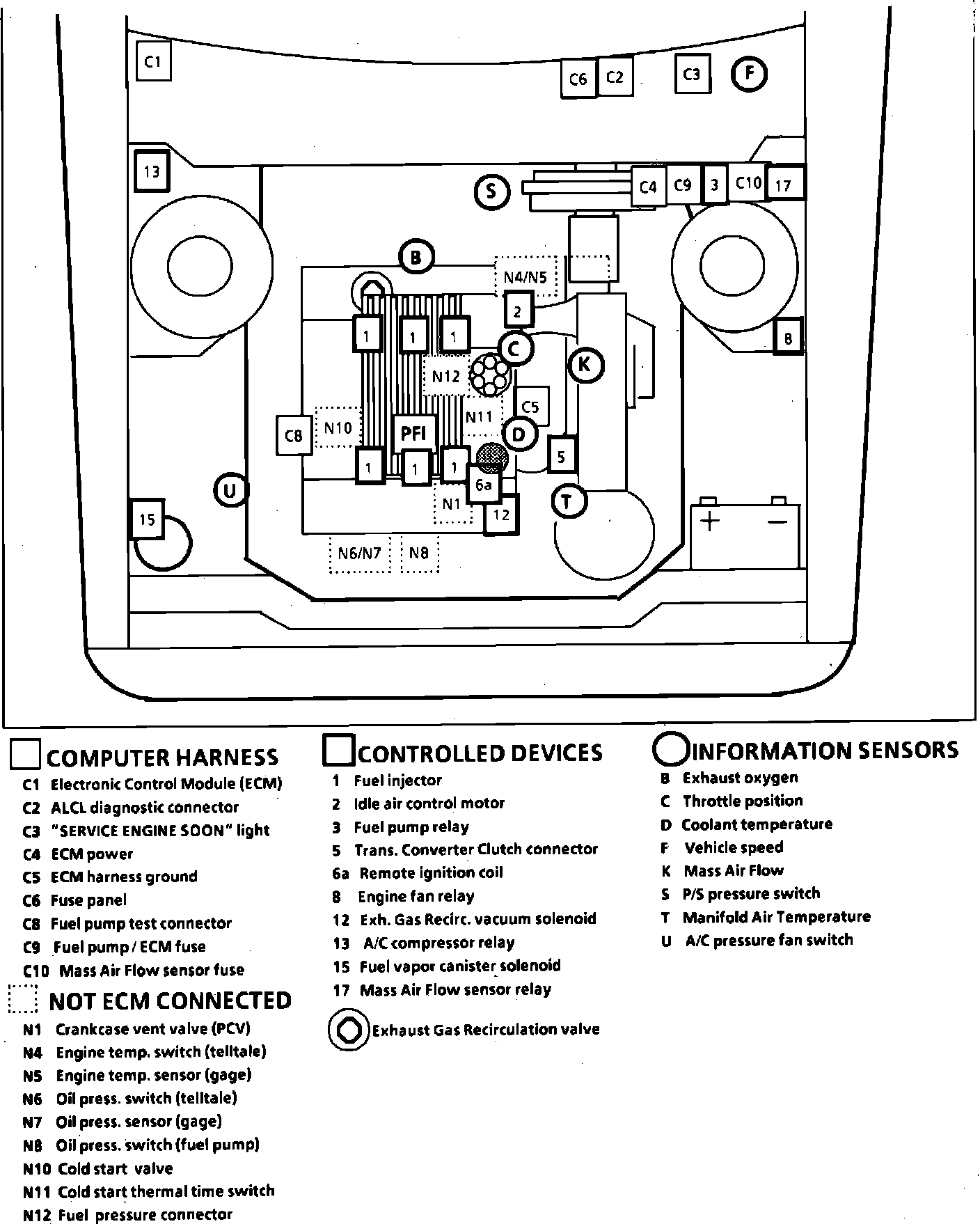Fig. 20 Emission Component Location. 1985 Firenza & Cavalier W/V6-173/2.8L, PFI: