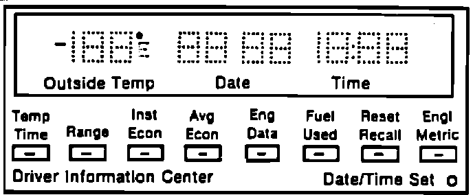 Battery Volts High--This message will appear when the charging system is overcharging the battery. After completing charging system diagnosis and repair, the message will be cancelled when battery voltage returns to 11.5 to 15.5 volts with engine operating. Battery voltage can be displayed on the Drive Information Center Display by depressing the Eng-Data button three times.