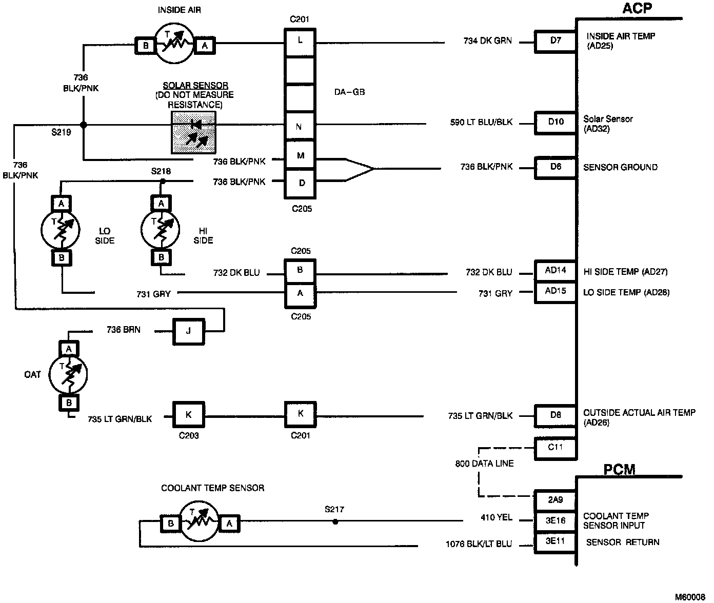 Given the driver's selected set temperature, the ACP uses the inside air temperature sensor (AD25) to determine if the interior of the vehicle requires heating or cooling to achieve and maintain the selected comfort level. The ACP monitors the outside temperature sensor AD26 , solar sensor (AD32) and the coolant temperature AD21 to determine the required air mix door position, blower speed and air delivery mode.