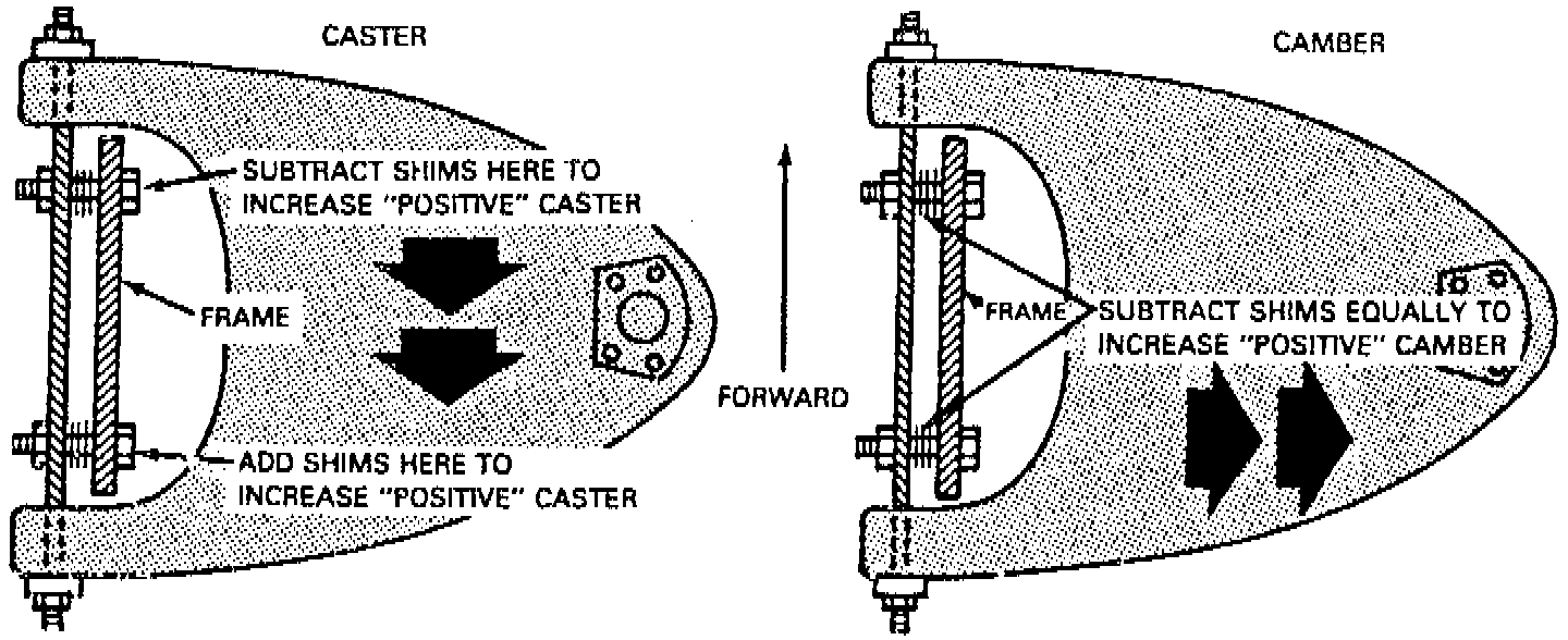Transfer shims from front to rear or rear to front. The transfer of one shim to the front bolt from the rear bolt will decrease positive caster. One shim (1/32 inch) transferred from the rear bolt to the front bolt will change caster about 1/2 degree.