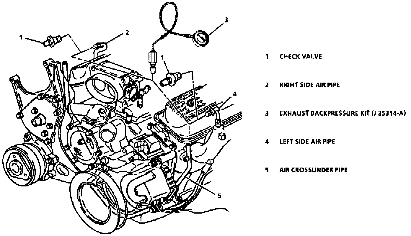 2. Connect Exhaust Backpressure kit (with air adapter) J35314-A as shown in accompanying image.