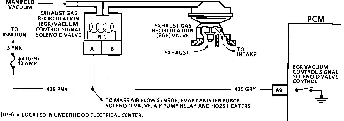 The EGR valve is controlled by a normally closed solenoid. The PCM turns the solenoid "ON" to allow vacuum to pass to the EGR, and turns the solenoid "OFF" to prevent EGR operation.