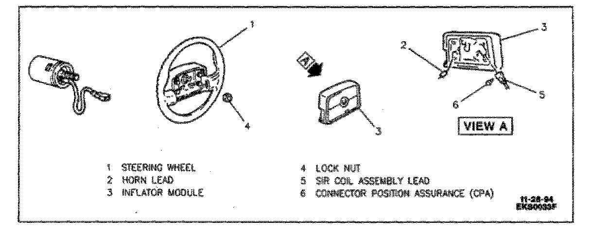 CAUTION: When carrying a live inflator module, make sure the bag and trim cover are pointed away from you. Never carry the inflator module by the wires or connector on the underside of the module. In case of an accidental deployment, the bag will then deploy with minimal chance of injury. When placing a live inflator module on a bench or other surface, always face the bag and trim cover up, away from the surface. Never rest a steering column assembly on the steering wheel with the inflator module face down and column vertical. This is necessary so that a free space is provided to allow the air bag to expand in the unlikely event of accidental deployment. Otherwise, personal injury could result.
