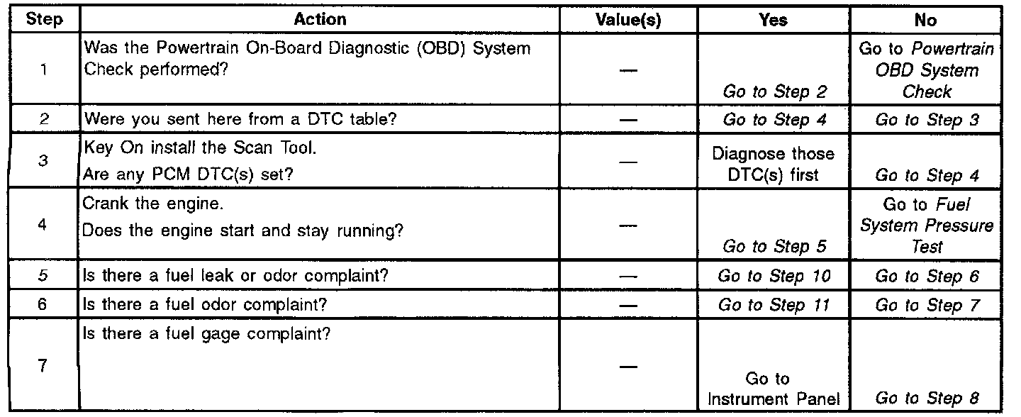 The Fuel System Check provides a quick analysis of the fuel system. This chart then identifies more detailed diagnosis required based on the symptoms present.