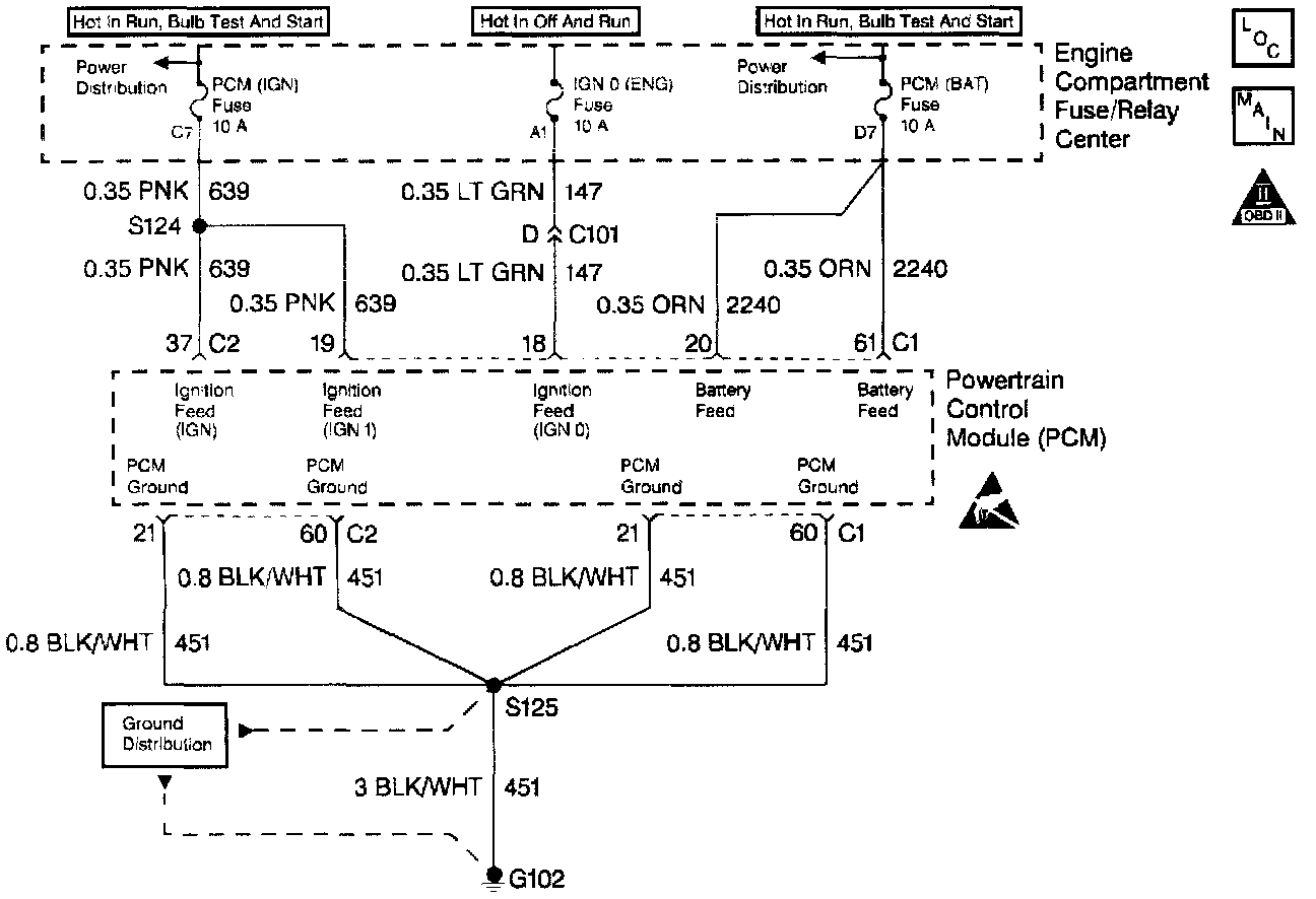 There are several vehicle grounds that are essential for proper powertrain system operation. Loose or poor ground connections may cause widely varying problems, from flickering telltales to PCM DTCs to driveability problems. The PCM Power and Ground Check should be performed when referred to by other diagnostics or when erratic or intermittent problems defy traditional diagnosis. The PCM Power and Ground Check chart lists these grounds and other pertinent information that will allow you to investigate a possible loose or faulty ground connection. PCM Power & Ground Check