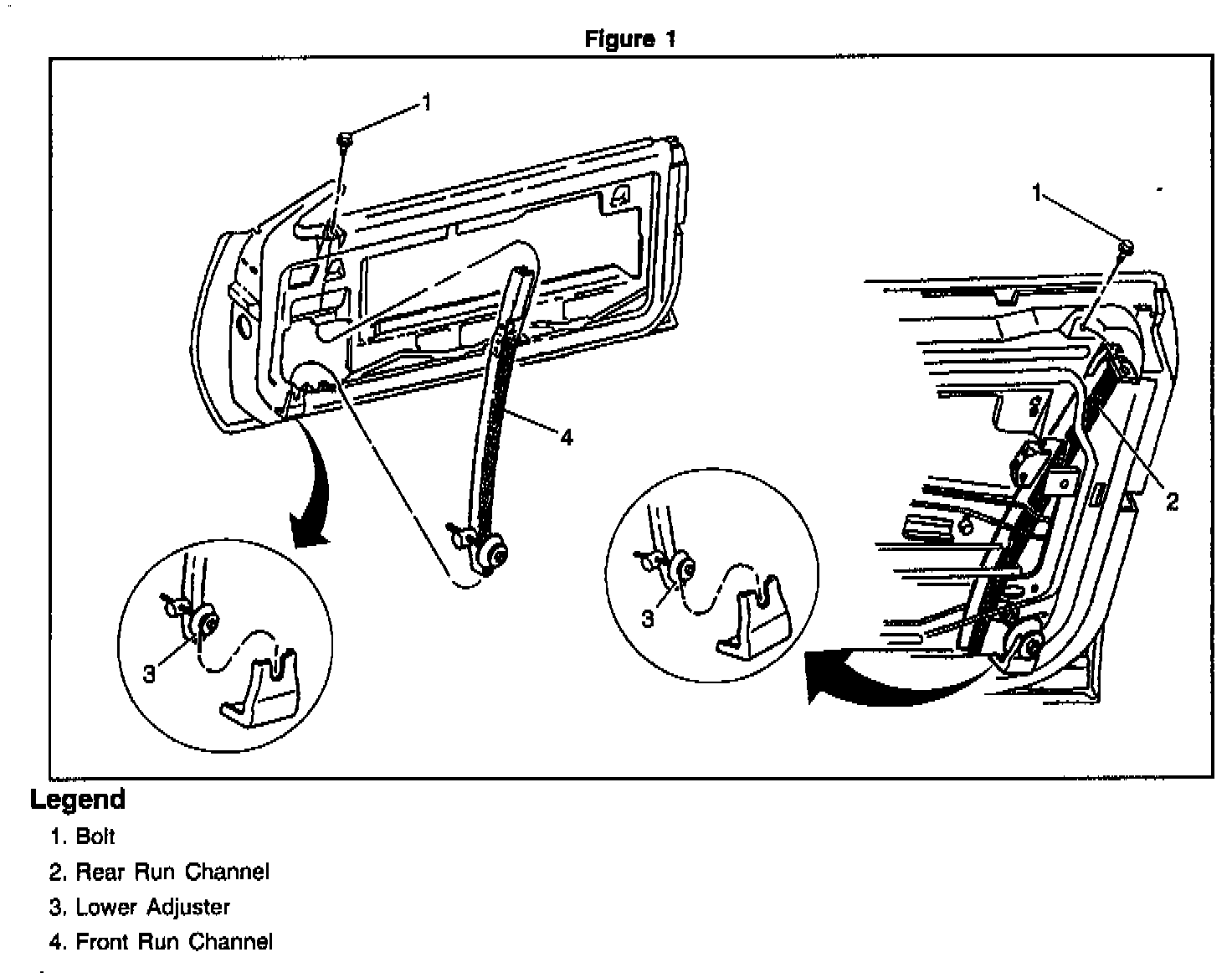 1. Rear run channel into door, aligning lower adjuster into retainer.