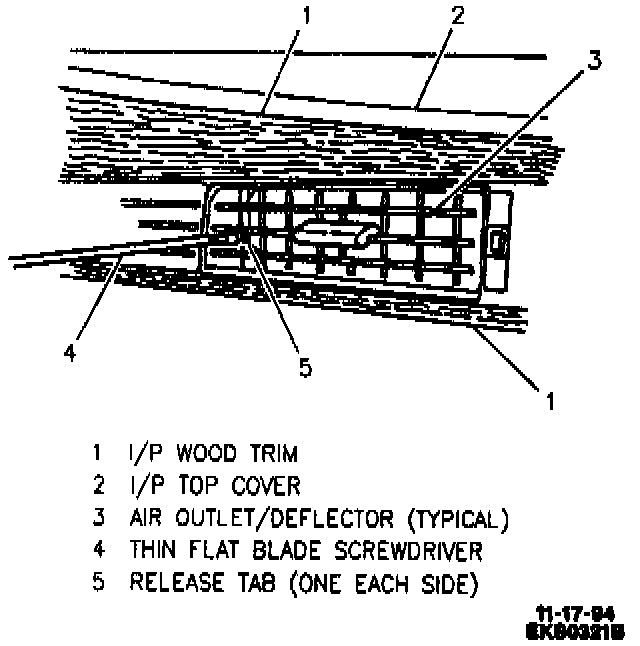 To remove A/C outlet grills insert a screwdriver between deflector and the duct housing on each side to release location tabs and slide out.
