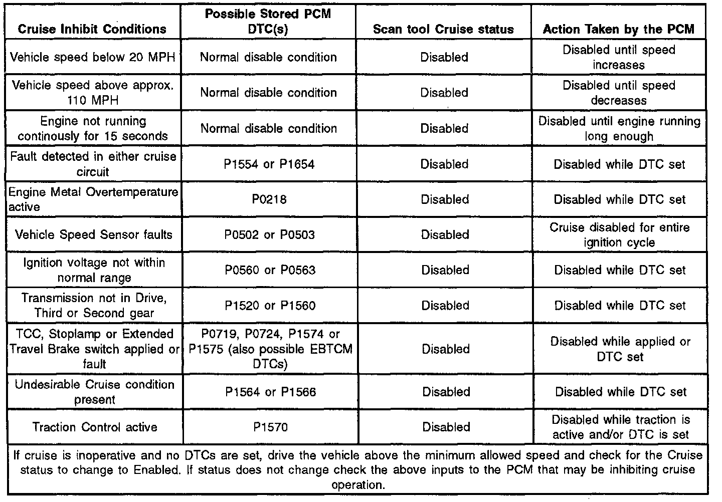This powertrain has a Stepper Motor Cruise Control (SMCC) system which closely approximates a stand alone system, except that the SMCC relies on the PCM to indicate that cruise control is allowed and then signals the PCM when engaged. This is accomplished by using a two wire link between the PCM and SMCC. These are called the Cruise Inhibit and the Cruise Engaged circuits. If the PCM will allow operation, refer to the Cruise Operation table, it signals the SMCC on the Cruise Inhibit circuit to allow cruise. Once cruise is engaged by the driver, the SMCC will continuously signal to the PCM that cruise is engaged using the Cruise Engaged circuit.