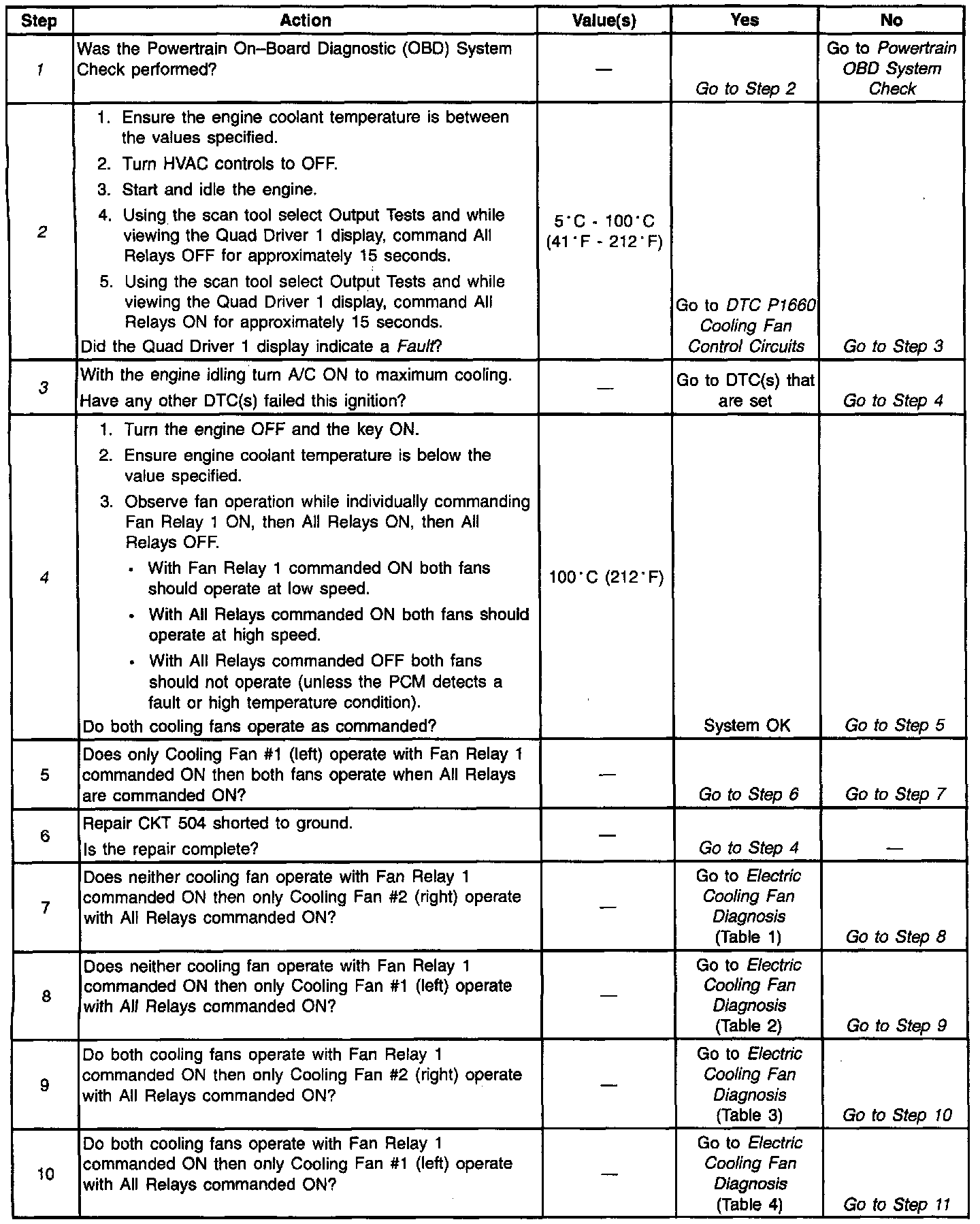 To determine if a fault is present perform the Cooling Fan Functional Check. If DTC P1660 is set, or sets during the functional check, it must be diagnosed before proceeding with any of the symptom tables. When the PCM commands low speed fan operation it grounds Cooling Fan Relay 1 which allows current to flow through both cooling fans in a series circuit to ground. If the PCM commands high speed fan operation it grounds all the cooling fan relays, including Fan Relay 1, which changes the circuit to a parallel circuit to ground. If a fault occurs certain symptoms will occur due to the series/parallel circuit design.