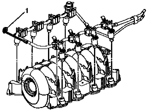2. Snap the entire fuel rail and injector assembly into the intake manifold by pressing the fuel rail and injector simultaneously into correct position. Keep the fuel rail ground wire (1) clear of the injectors.
