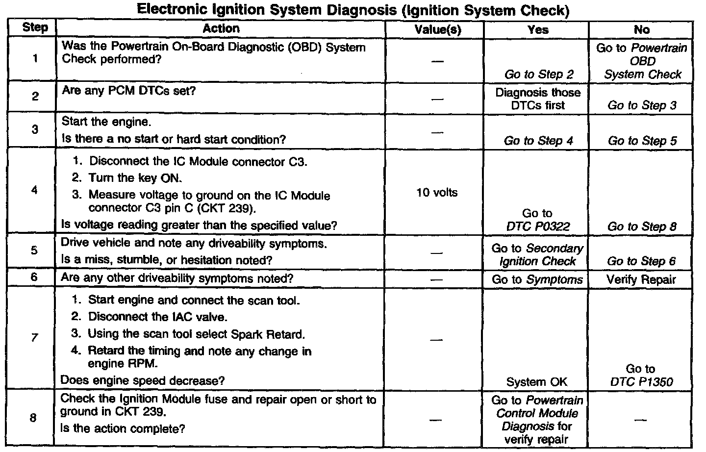 When any condition is suspected to be caused by or related to the ignition System, the first step in diagnosis should be to check for stored PCM DTC's. Diagnose all DTC's before further action is taken. The Ignition System Check provides a means of testsing ignition system performance and references other tables for specific ignition system conditions.