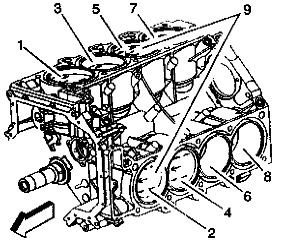 2. Select the correctly numbered piston/connecting rod assembly for the cylinder. An arrow (9) showing proper piston orientation is located on the top of the piston.