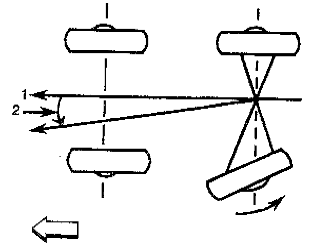 The front wheels aim or steer the vehicle. The rear wheels control tracking. The tracking action is relative to the thrust angle (2). Thrust angle (2) is defined as the path that the rear wheels will take. The thrust angle (2) should be aligned with the body centerline (1).
