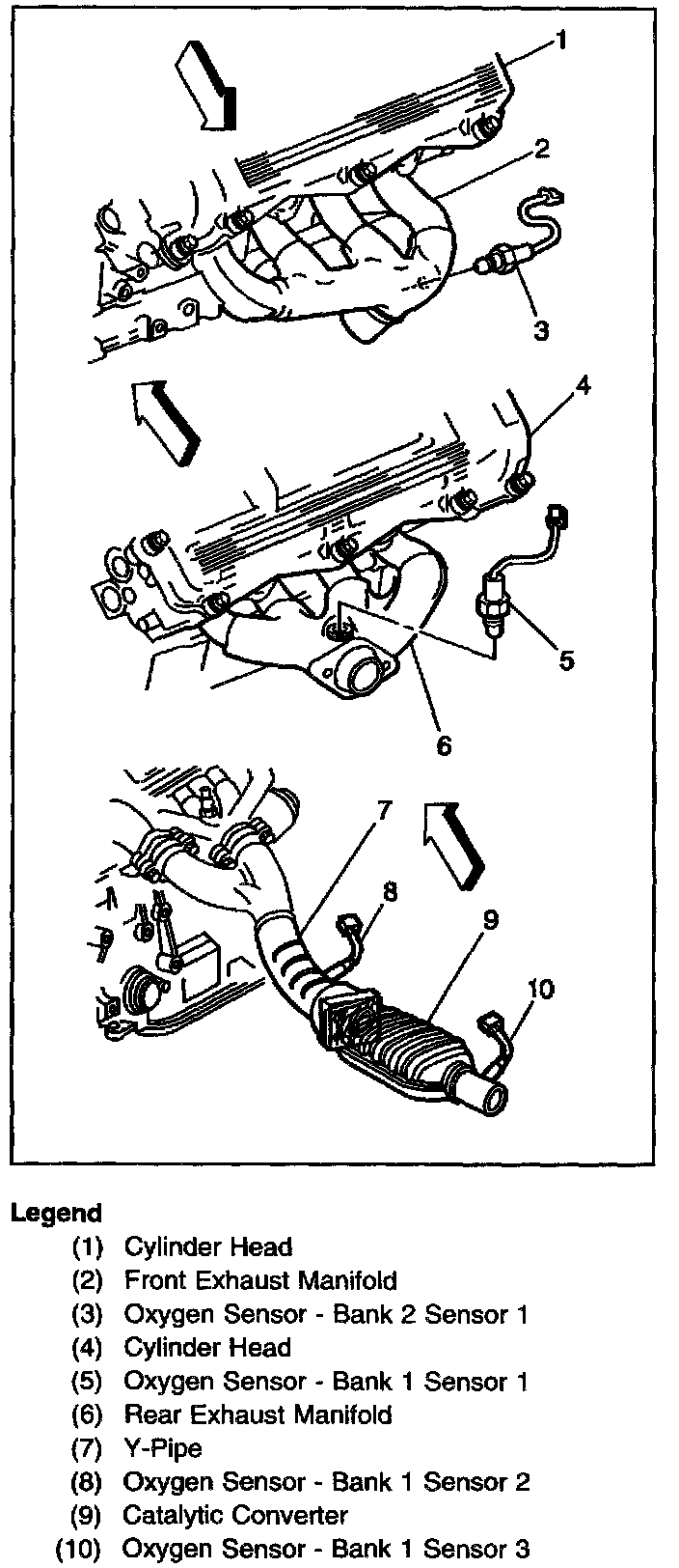 The three or four oxygen sensors are mounted in the exhaust system where they monitor the oxygen content in the exhaust stream. There is an oxygen sensor mounted in each exhaust manifold and one on the downstream end of the catalytic converter. Some early production vehicles also have an oxygen sensor located at the front of the catalytic converter (Pre-converter). The oxygen sensor located in the front exhaust manifold is the Bank 2 Sensor 1 (Front bank) sensor. The oxygen sensor located in the rear exhaust manifold is the Bank 1 Sensor 1 (Rear) sensor. The oxygen sensor located in the Y-pipe ahead of the catalytic converter is the Bank 1 Sensor 2 (Pre-converter) sensor. The oxygen sensor located in the catalytic converter outlet is the Bank 1 Sensor 3 (Post-converter) sensor.
