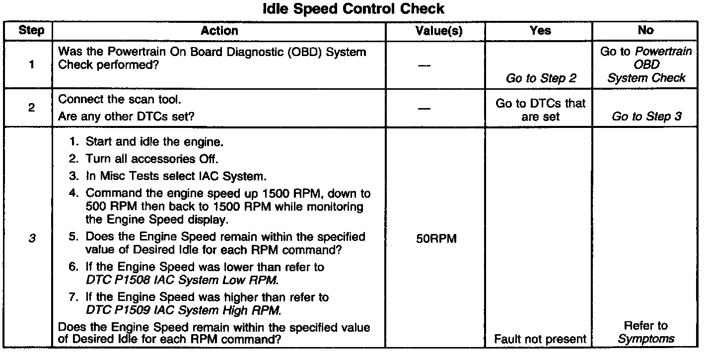 3. This check test the IAC valve to make sure that it is moving in and out without binding. When the IAC valve is commanded the PCM adjusts the IAC position and spark advance for a desired RPM.