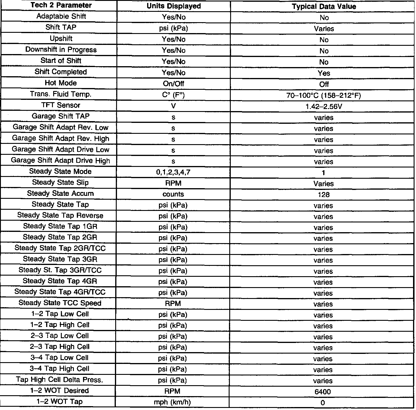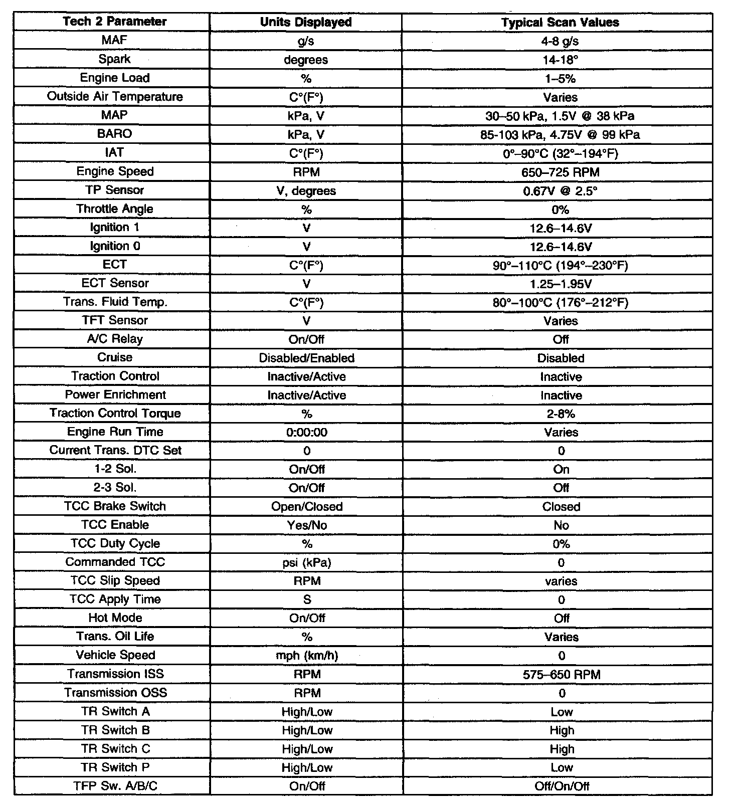 If you have completed the On-Board Diagnostic (OBD) system check, if the diagnostics are functioning properly and if no Diagnostic Trouble Codes (DTCs) display, you may use the Typical Scan Values in the table shown for comparison within the appropriate transmission. These typical values are an average of display values recorded from normally operating vehicles. They represent the display from a normally functioning system.You should never use a scan tool that displays faulty data. The condition should be reported to the manufacturer. The use of a faulty scan tool can result in misdiagnosis and the unnecessary replacement of parts.
