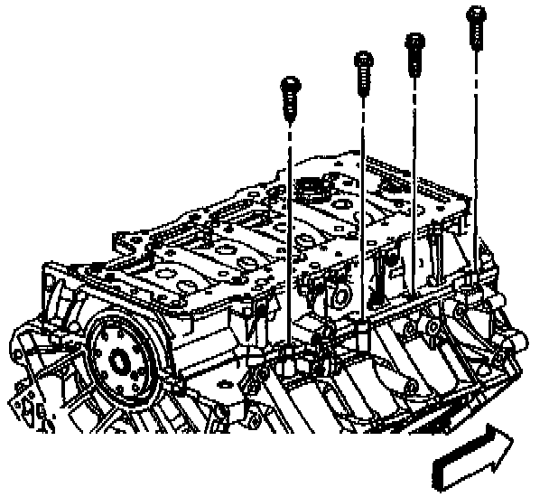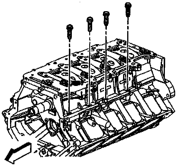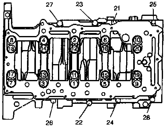 ^ Using the J 36660, tighten the lower crankcase bolts (numbers 1 through 20) an additional 65 degrees in the proper sequence.