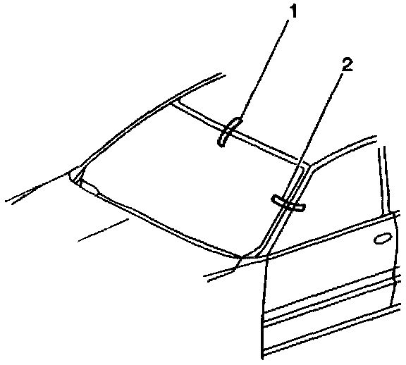 3. Install the acoustic strip (2) with a 2 mm or less gap (3) to the dashed line (1) painted on the windshield.
