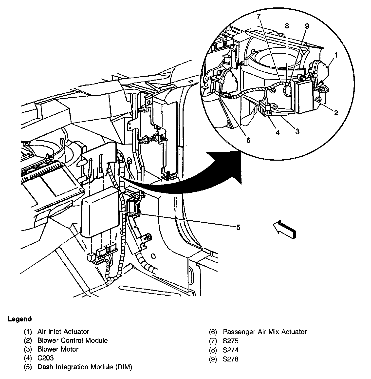 Right side of the instrument panel, near the blower motor