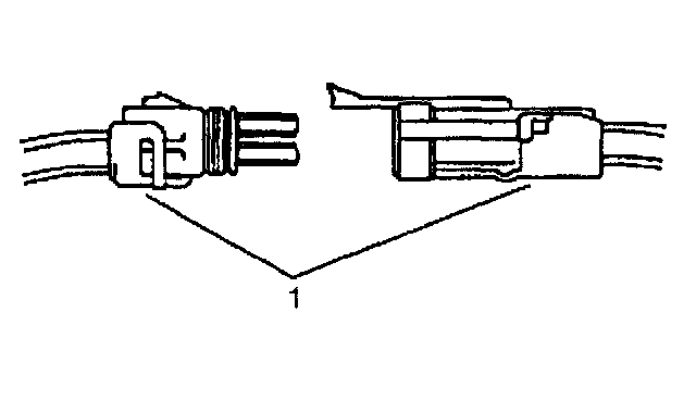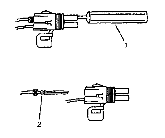^ Insert the Weather Pack(R) terminal removal tool into the front (mating end) of the connector cavity until it rests on the cavity shoulder (1).