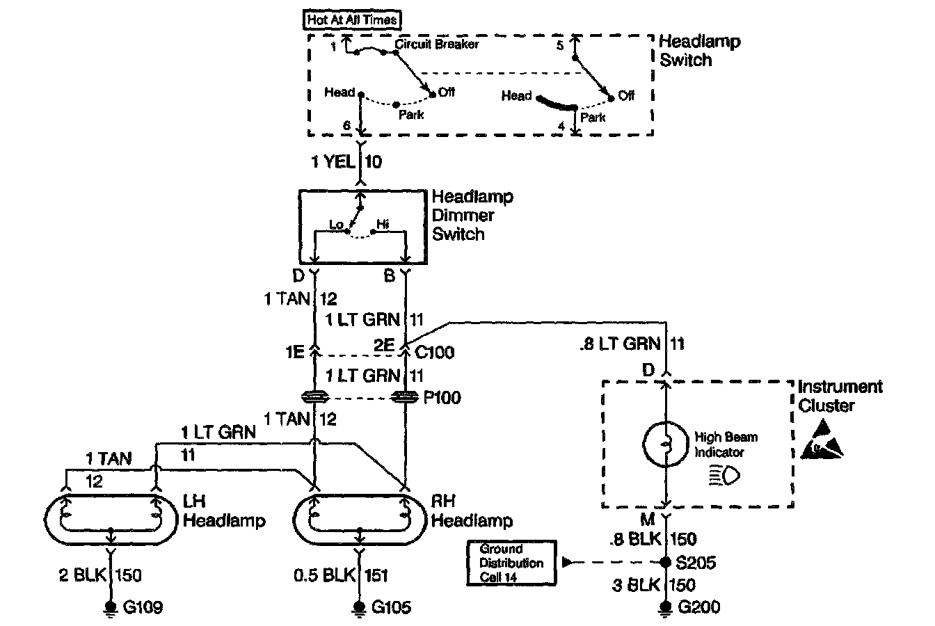 At this point analyze and (diagnose the problem), and develop text. Since the high beam indicator illuminated when the headlamp dimmer switch was in the high position, the high contacts of the headlamp dimmer switch and the LT GRN wire between the headlamp dimmer switch and C100 are good.