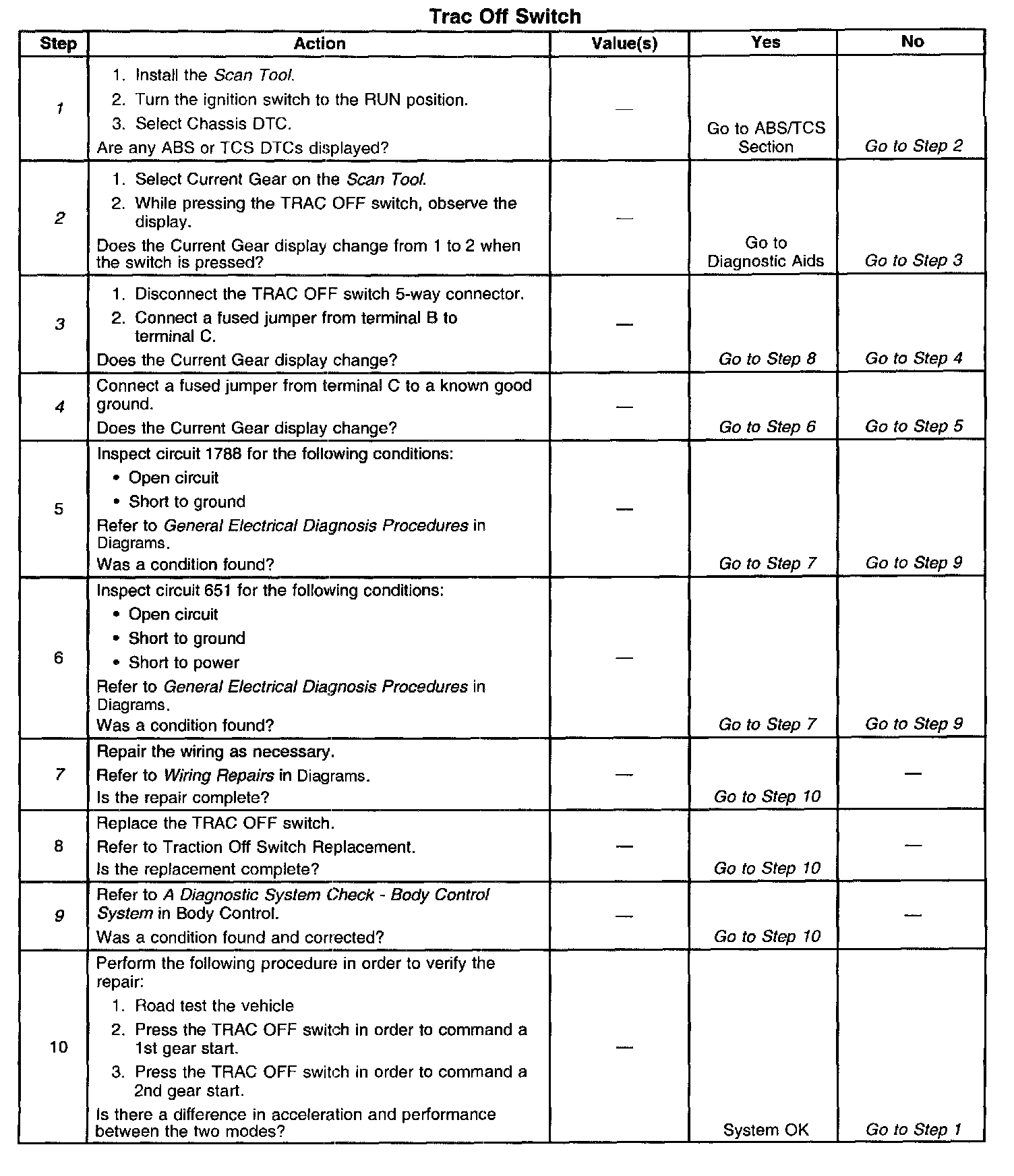 7. This step replaces the TRAC OFF switch. Previous steps found no fault in the power or ground circuits.