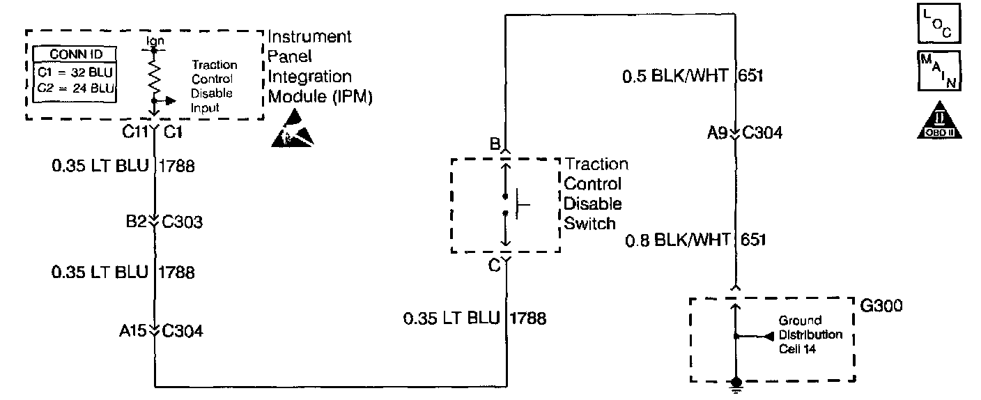 The TRAC OFF switch is a momentary contact switch. Depressing the switch creates a ground path for the Instrument Panel Integration Module (IPM) ignition voltage input. When the IPM senses this voltage drop, the module turns OFF the traction control. The IPM sends a serial data message to the Electronic Brake and Traction Control Module (EBTCM). The EBTCM sends a serial data message to the PCM. Upon receiving this signal the PCM commands a second gear start for that ignition cycle.